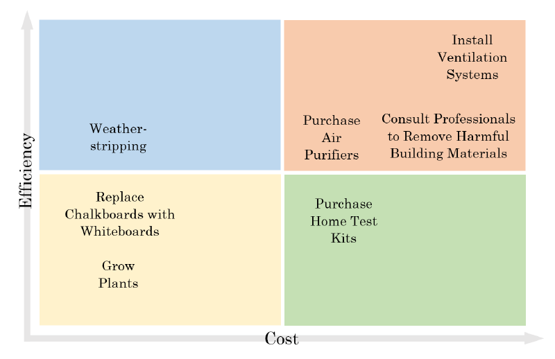 The following chart summarizes the techniques that have been mentioned thus far in terms of efficiency and cost. Understanding these options would allow you to make an informed decision according to your personal circumstances in order to improve the air quality in your school.