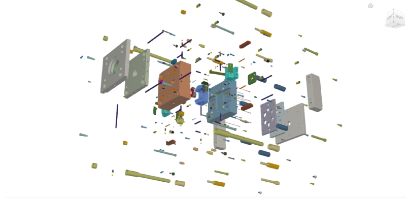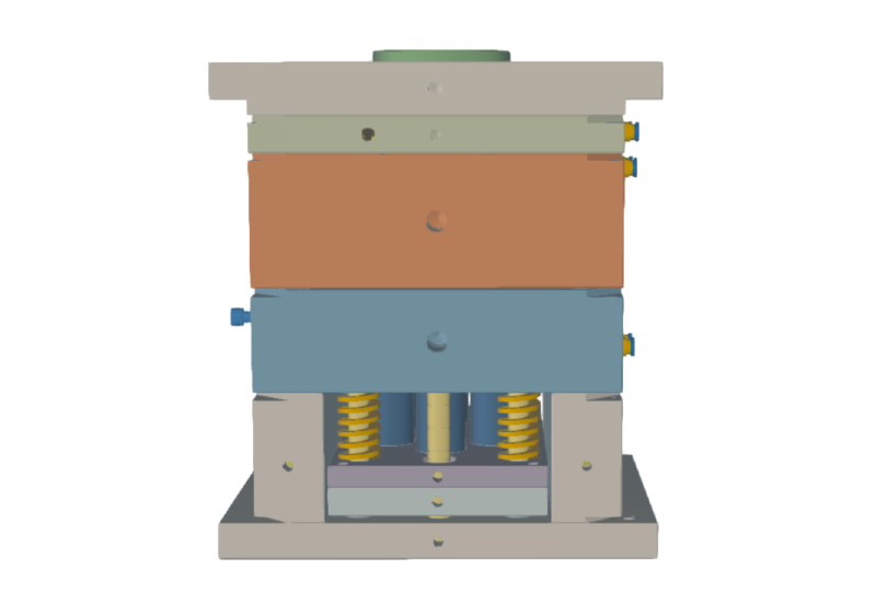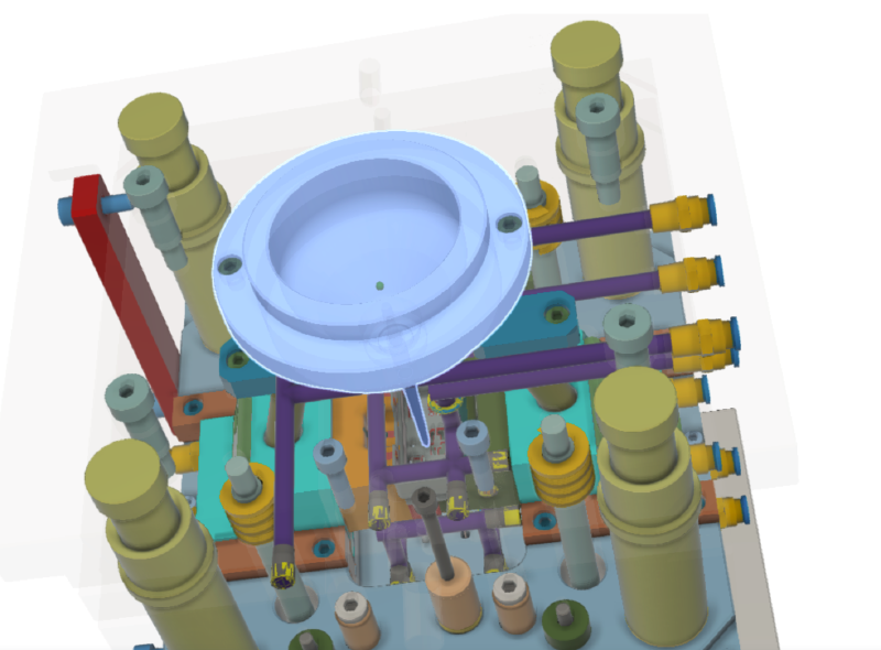 In the AirGradient Go tool, you can see that “layering” very clearly: big grey plates acting as the structural backbone, the central blue-grey assembly where the part-forming surfaces and inserts sit, and the “cloud” of hardware around it that makes the whole machine repeatable.
