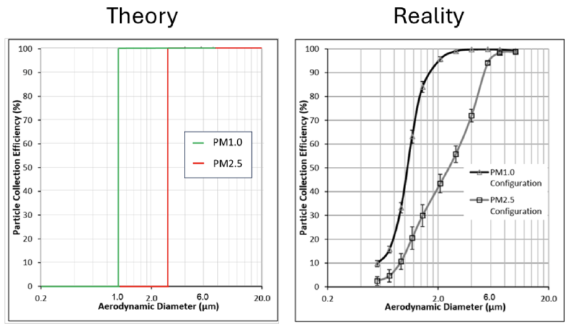 In practice, this looks very different (see Figure 3 right). For example, we see that at 2.0 μm, ca. 40 % of the particles do not make it through the PM2.5 inlet, although PM2.5 is defined as all particles smaller than 2.5 μm. On the other hand, ca. 95 % of the 2.0 μm particles do not make it through the PM1 inlet, while 5 % will reach the filter and contribute to the PM1 measurement although the particles are bigger than 1 μm.