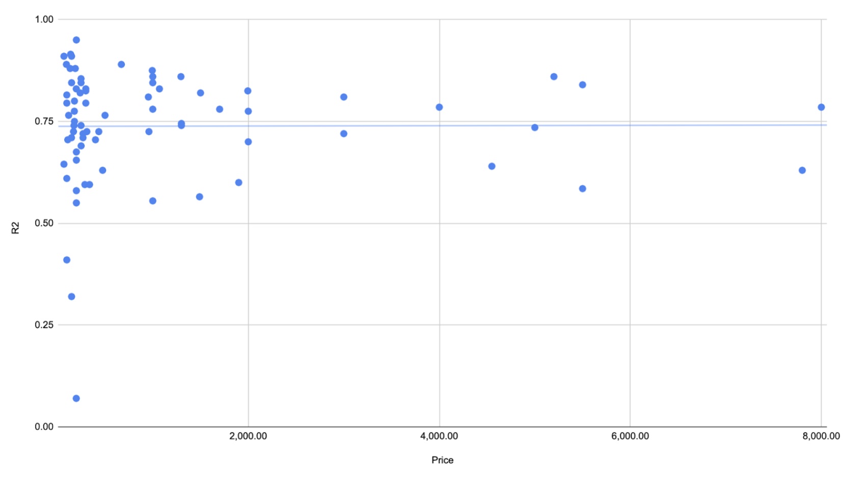 When we plot the accuracy (R2) against the price of all the monitors tested, we can see the following: