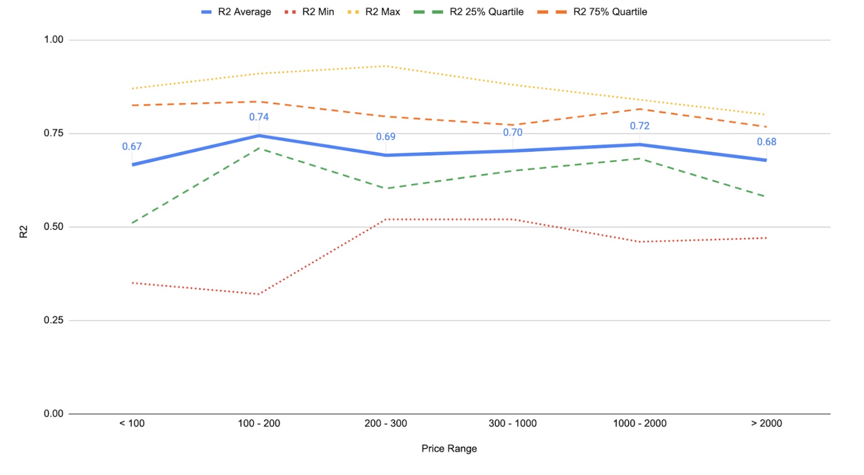In the next figure, I separated the monitors into different price ranges and show the average, minimum, maximum as well as 25% and 75% quartile of R2. Here we can see that monitors in the price range of USD 100 - 200 seem to offer the best accuracy and that the most expensive monitors accuracy is pretty much the same as of the cheapest monitors.