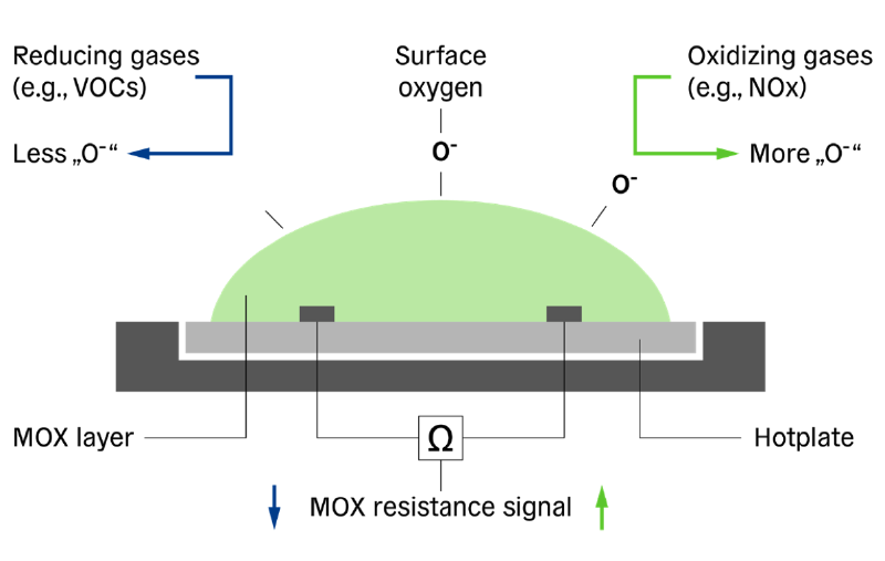 A MOx sensor consists of a heated metal oxide surface that measures changes in electrical resistance as gas molecules interact with it. The sensor reacts based on the oxygen content on its surface: