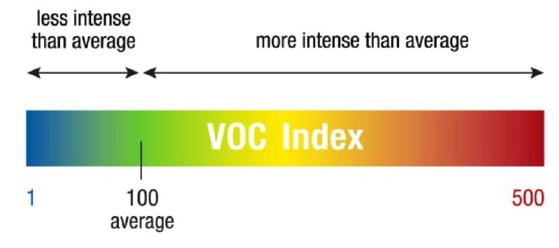 | 100 | Baseline. Represents the average VOC level over the past 24 hours. If the sensor shows 100, it means that the concentration hasn’t changed recently. |