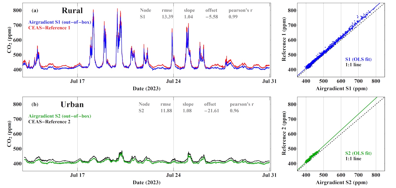 Even before applying any compensation algorithms, the performance of the low-cost CO2 sensors is very good with a high correlation to the reference instruments and only a small offset. Furthermore the CO2 sensors inside the Open Air demonstrate a very good sensitivity and excellent dynamic range for ambient applications as depicted by the remarkable agreements under low (urban) and high (rural) CO2 mixing ratios.