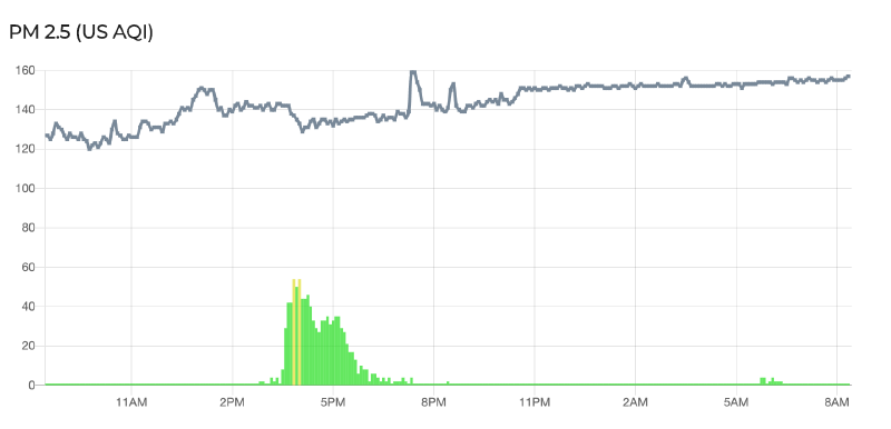 The spike at around 5 pm was the result of having a window open. Other than that you can see that the pollution in the room was most of the time Zero.