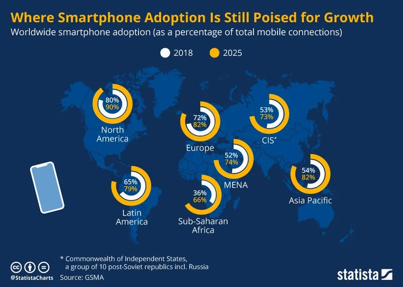 Organisations in Kenya, Nigeria and other African countries were quick to remind us that, especially in rural areas of the continent, where there is no stable power grid or internet connection, social media is not the main form of communication. There, smartphone and social media access is still more limited than in the Global North or even in lower-income parts of the Global South. When we asked our employees living in LMICs, they agreed that in Thailand or the Philippines, even very impoverished communities use smartphones, but this is not the case in Sub-Saharan African countries. As the diagram below shows, Sub-Saharan Africa has the lowest rate of smartphone adoption at just 66%, whereas the Asia Pacific is at 82% and Latin America at 79%. So, whereas even the poorest communities in Southeast Asia might use social media for information, this doesn’t ring true globally.