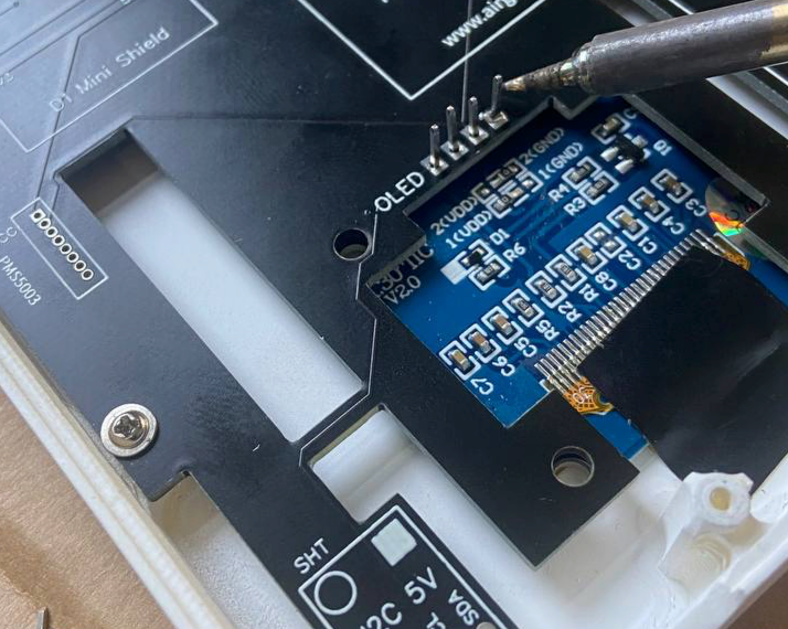 - Solder the display in. Please solder as fast as possible to prevent the enclosure opposite of the pins to melt or get melt points. Put solder temperature on the lowest temperature that ensures proper contact. After the soldering done, use a fan to cool down the solder points as fast as possible.